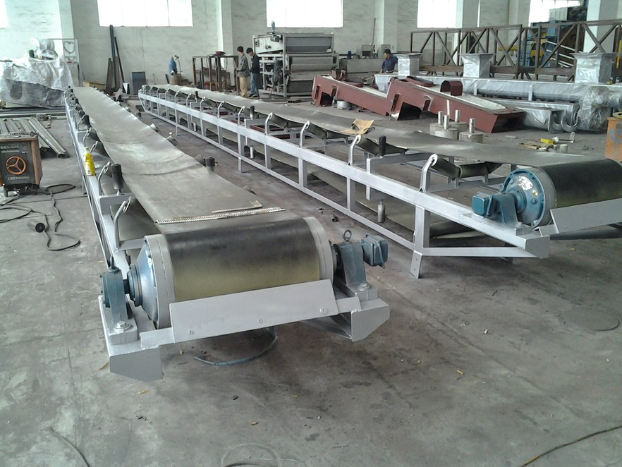 带式输送机是一种摩擦驱动以连续方式运输物料的机械。主要由机架、输送带、托辊、滚筒、张紧装置、传动装置等组成。它可以将物料在一定的输送线上,从最初的供料点到最终的卸料点间形成一种物料的输送流程。它既可以进行碎散物料的输送,也可以进行成件物品的输送。除进行纯粹的物料输送外,还可以与各工业企业生产流程中的工艺过程的要求相配合,形成有节奏的流水作业运输线。