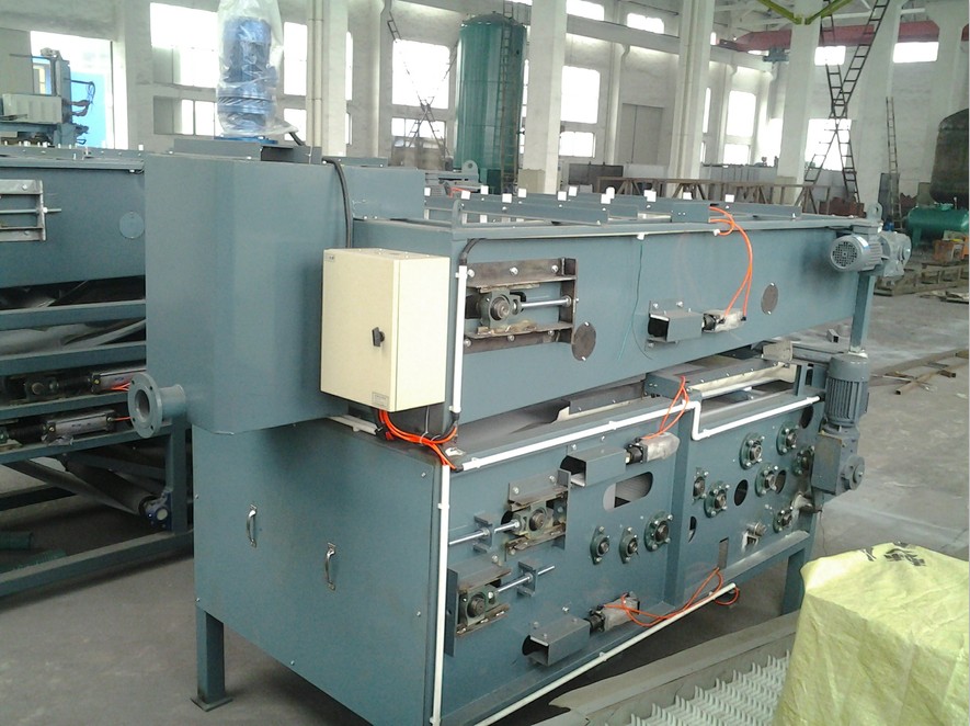 带式压榨过滤机主要由驱动装置、机架、压榨辊、上滤带、下滤带、滤带张紧装置、滤带清洗装置、卸料装置、气控系统、电气控制系统等组成。