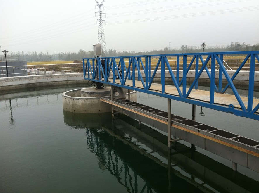 刮泥机由驱动装置、工作桥、主刮泥装置、辅助刮泥装置、中心转盘、导流桶、溢流堰板和挡渣板等组成。驱动装置带动刮泥机绕沉淀池中心旋转,原水经沉淀池沉淀后,上清液从溢流堰板排出,沉淀于池底的污泥,在刮板的推动下,缓慢地沿池底流向中央集泥槽内,通过排泥管排出。